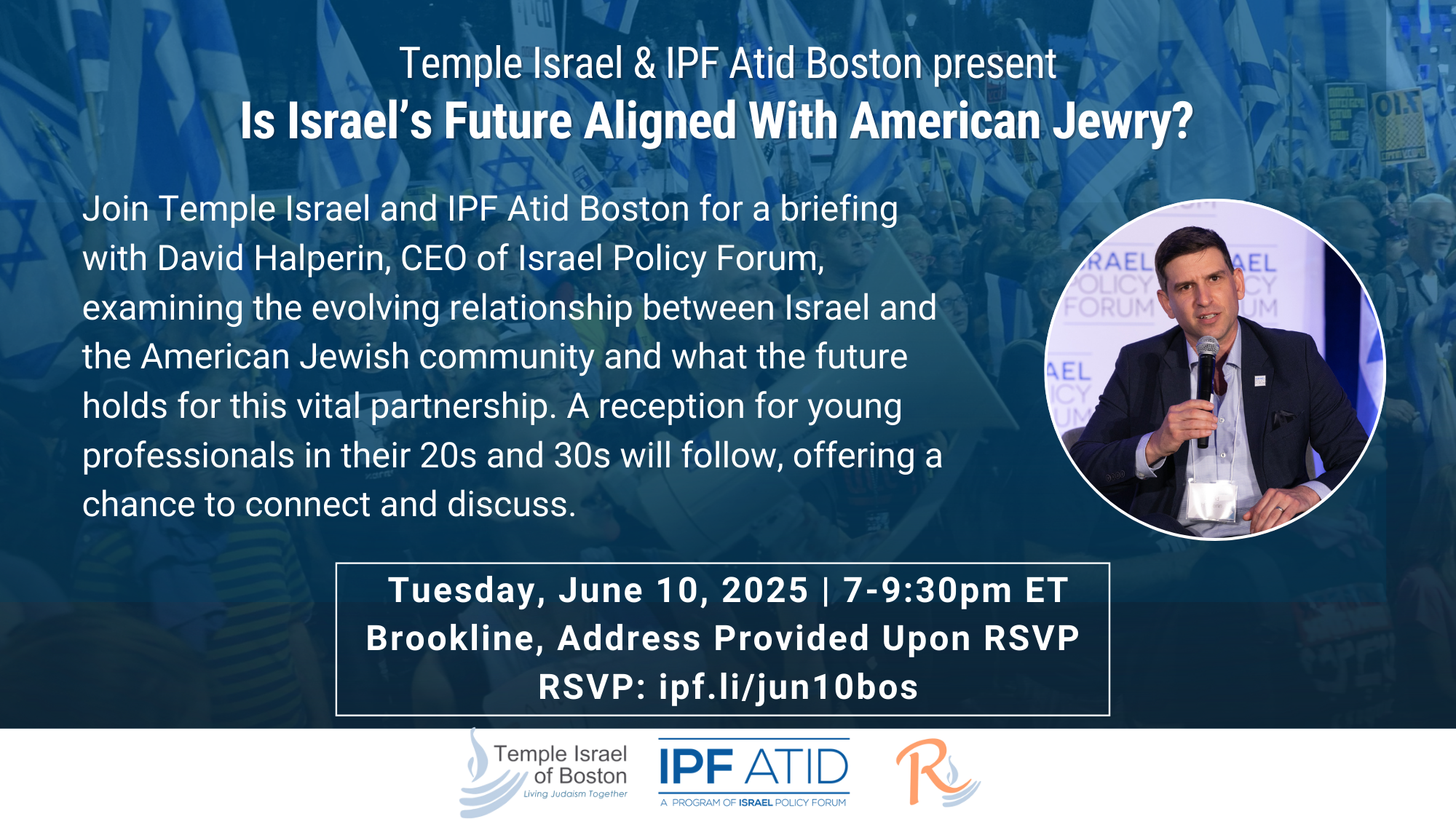 Join Temple Israel and IPF Atid Boston for a briefing with David Halperin, CEO of Israel Policy Forum, on the shifting landscape of leadership and policy in the Middle East. With a focus on the critical role of the U.S.-Israel relationship and broader regional dynamics, this discussion will explore the strategic priorities shaping the future of the region. Halperin will examine the evolving relationship between Israel and the American Jewish community and what the future holds for this vital partnership.